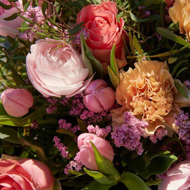 Petit bouquet (celui en photo) : 5 Tulipes roses de notre production, 3 renoncules roses, 3 Oeillets 'Caramelo', 3 Limonium, 3 Roses 'Hermosa'. Feuillage : Eucalyptus Populus.