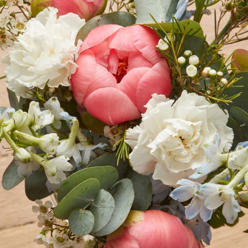 Bouquet taille S : 5 pivoines "Coral Charm", 3 delphinium, 3 wax blancs, 3 dianthus blancs, 5 eucalyptus cinerea
