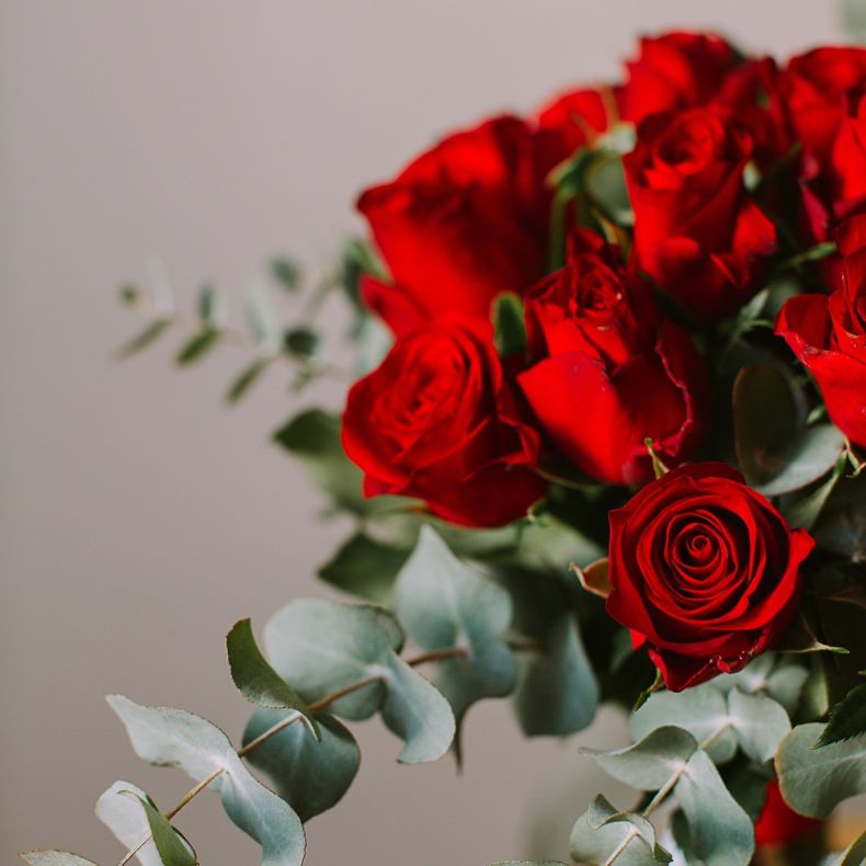 Le bouquet Opéra :20 roses rouges Furiosa de notre production. Feuillage : Eucalyptus.