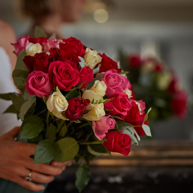Grand bouquet : mix de 50 roses parmi ''furiosa'', ''athena'', ''fushiana'', ''dekora''.Feuillage : Eucalyptus